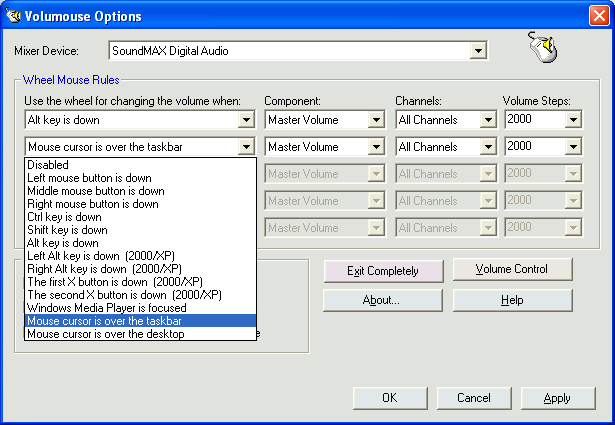 Volumouse is a unique and handy utility, that allows you to adjust your speaker volume by using your mouse wheel. In order to preserve other functionalities of your mouse wheel, the program offers several combinations, so that volume adjusting will only be used when for example an additional keyboard key is pressed. We liked the option best, which would automatically use the mouse wheel for volume adjustment when you move your pointer over the taskbar - anywhere else on the screen, the mousewheel has the standard functionality. There are various combinations available, including an option that will only use the mouse wheel for volume if Media Player is in the foreground.