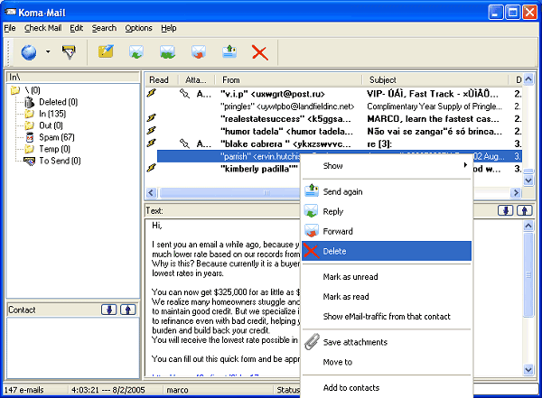 Koma-Mail is a simple, portable email client, that can be run standalone from a USB drive. It allows you to send and receive email from your POP3/IMAP account. The program supports SSL and APOP and contains options to block scripts, ActiveX and HTML content for increased security. It also includes a basic spam filter option and can be used with multiple accounts and multiple users. Koma-Mail can import/export email messages and contacts, maintains an encrypted database and even includes a simple RSS feed reader.