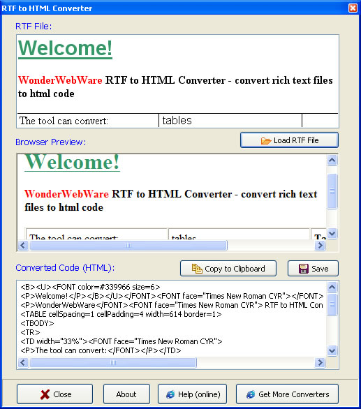 Use RTF to HTML Converter to convert standard RTF files to HTML code. The tool uses IE internal conversion functions and should convert any standard rich text document. Please, note that RTF to HTML converter cannot process images and other external objects, in addition - not everything prodused by Word as rtf file will be converted - for example, table background colors may be lost, or some font settings... The best way to see the result is by converting the respective RTF file and check the output HTML code