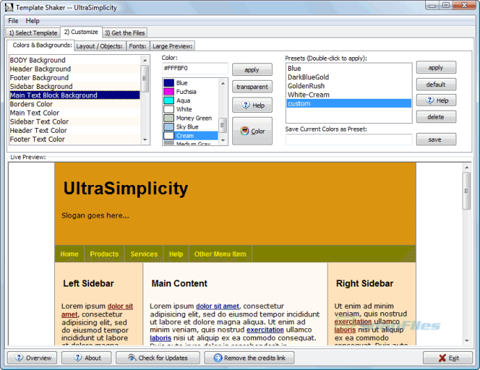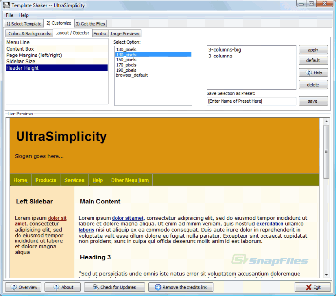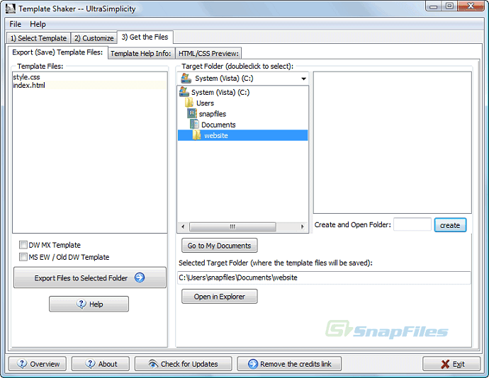 TemplateShaker (Free Edition) offers a WYSIWYG environment to create a CSS driven web site based on 4 different layout templates that can be customized your preference. The step-by-step process allows you to pick colors and fonts for your page content, insert images, tweak the page layout and more. Once you are satisfied with the design you can preview the XHTML and CSS code and export all the necessary files into your web folder. The free version is restricted to non-commercial use and inserts a credit line into the bottom of each page.