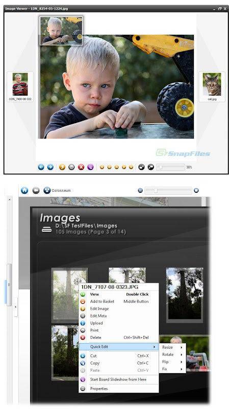 Visions is an innovative image viewer and manager that offers 3D-style navigation of your image folders along with photo editing and sharing. You can open multiple folders as individual boards, switch between them and easily drag&drop images from one folder into the other. The standard image editing options allow you to adjust color, brightness, contrast and other image settings as well as to crop and resize your photos. Other features include EXIF tag editing, optional Flickr integration, image search and more.